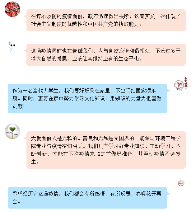 同学们观看了沈院长的“开学第二课”后受到了很大的鼓舞,自发的通过文字为武汉加油。