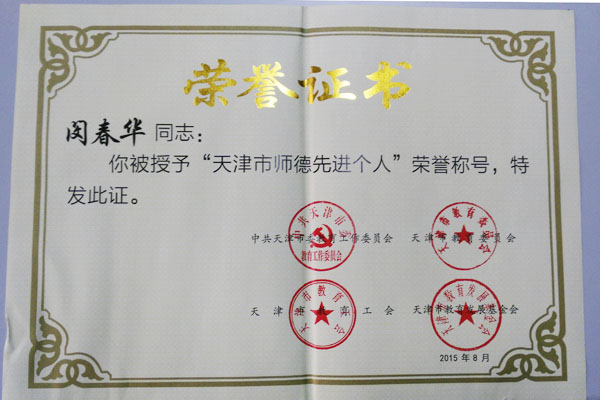 在第31个教师节到来之际,中共天津市委教育工委、天津市教委联合表彰了一批2012年以来在教师职业道德建设和大学生思想政治教育方面做出突出贡献、取得优异成绩的先进个人。永利集团官网闵春华教授获“天津市师德先进个人”称号。 此次评选,全市共有300名同志被授予“天津市师德先进个人”荣誉称号。我校共有四名教师获此称号。