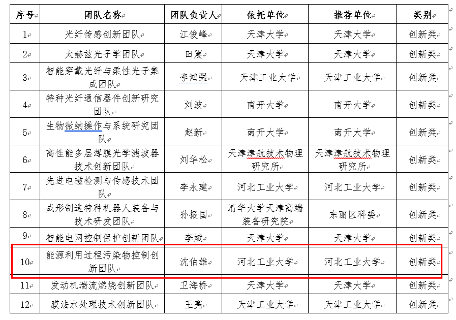 永利集团官网沈伯雄教授领衔的“能源利用过程污染物控制创新团队”入选第三批天津市人才发展特殊支持计划高层次创新创业团队