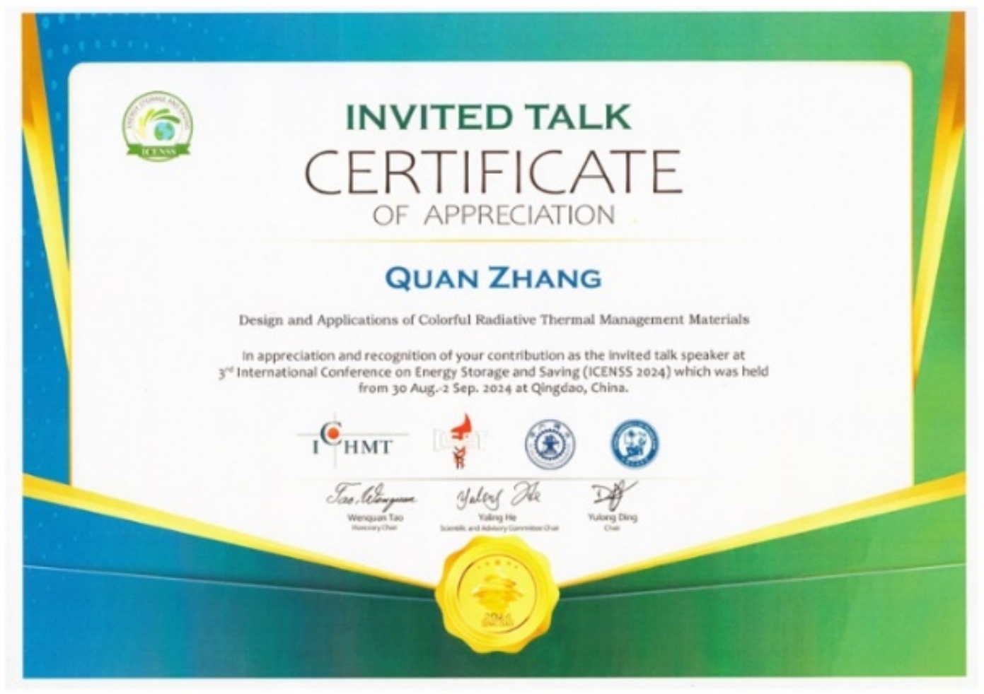 此外,张权老师受邀作了题为“Design and Applications of Colorful Radiative Thermal Management Materials”的报告,向与会专家汇报了课题组在彩色辐射热管理技术方面的最新研究进展,并就研究中的相关问题进行了充分讨论。