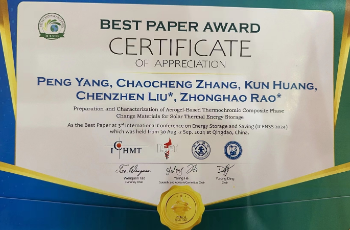 硕士研究生杨鹏做了题为“Preparation and Characterization of Aerogel-Based Thermochromic Composite Phase Change Materials for Solar Thermal Energy Storage”的口头汇报,介绍了用于太阳能热利用领域的新型复合相变材料方面的研究工作,该论文荣获第三届储能与节能国际研讨会最佳论文奖。