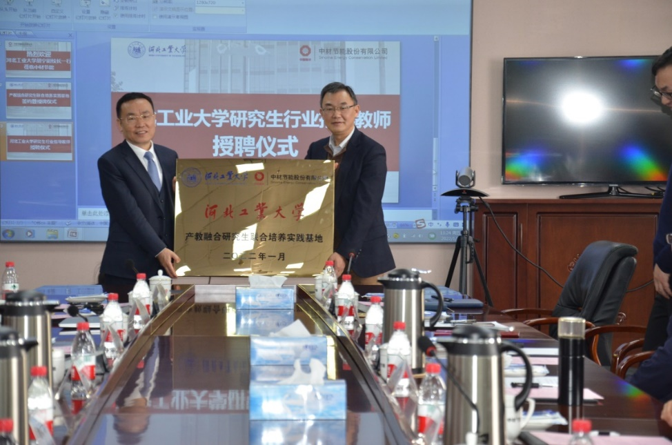 副校长胡宁代表学校向中材节能股份有限公司授牌“永利集团3044官网欢迎您产教融合研究生联合培养实践基地”,中材节能股份有限公司董事长孟庆林接牌